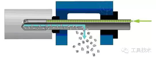 槍鉆(見圖1)的鉆柄是空的,由內(nèi)外部供應的切削液流經(jīng)鉆頭內(nèi)輸送管,并強行流經(jīng)切削頭內(nèi)的孔。鉆柄外側有一個沿著長度方向的V形槽,切削液攜帶切屑通過此V形槽,并經(jīng)過鉆頭外側,最終切屑從孔中排出。槍鉆可應用于普通加工中心,但是需要高壓力的切削液。