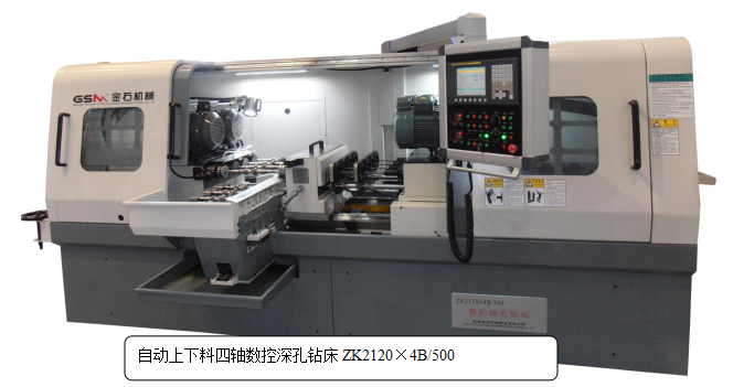 應廣大用戶的要求,金石機械在之前制造四軸槍鉆機床的基礎上,針對工件裝卸的不便及費時的缺點,研發(fā)了如下自動上下料的四軸深孔鉆床。大大提高了槍鉆機床的利用率,并降低了操作工人的勞動強度。很快得到廣泛應用。