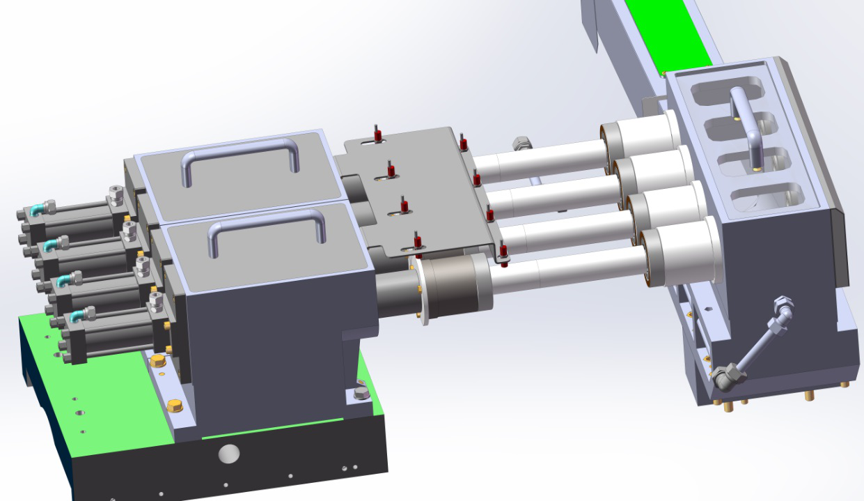 4. 左筒夾液壓驅(qū)動,從左向右伸出,將工件左端套進(jìn)筒夾內(nèi)孔,繼續(xù)向右,推動工件進(jìn)入右端的筒夾內(nèi)孔。筒夾彈簧套收縮,夾緊工件。