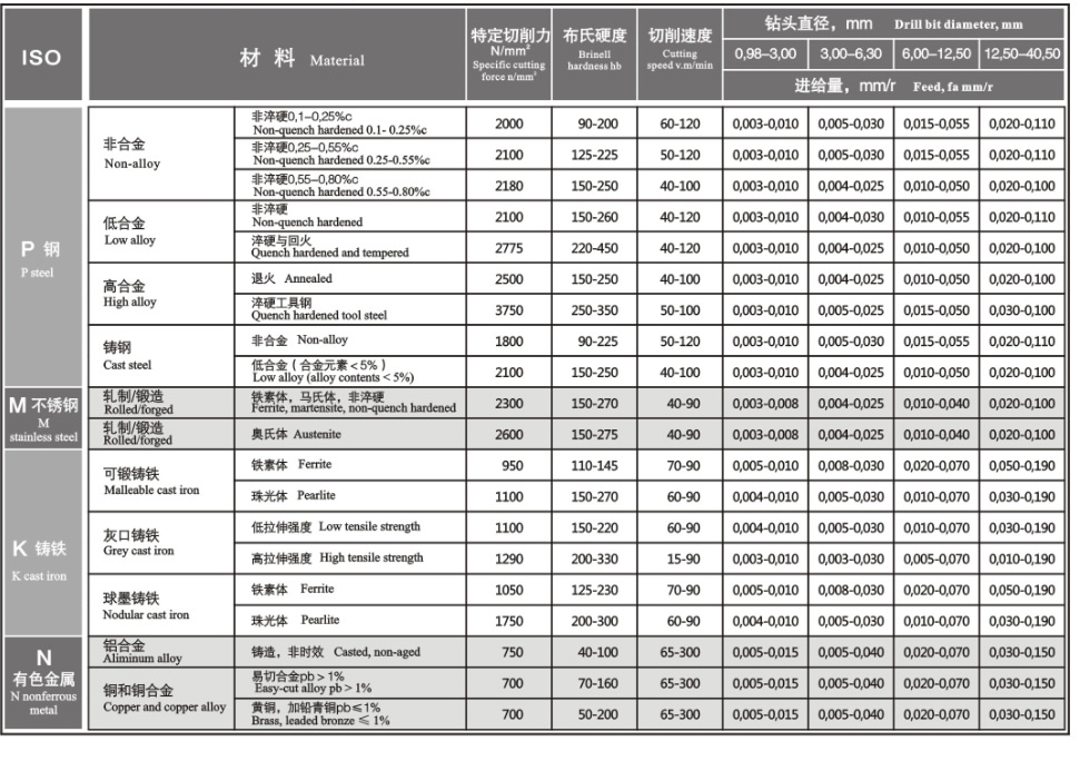 槍鉆切削參數(shù)參考下表: